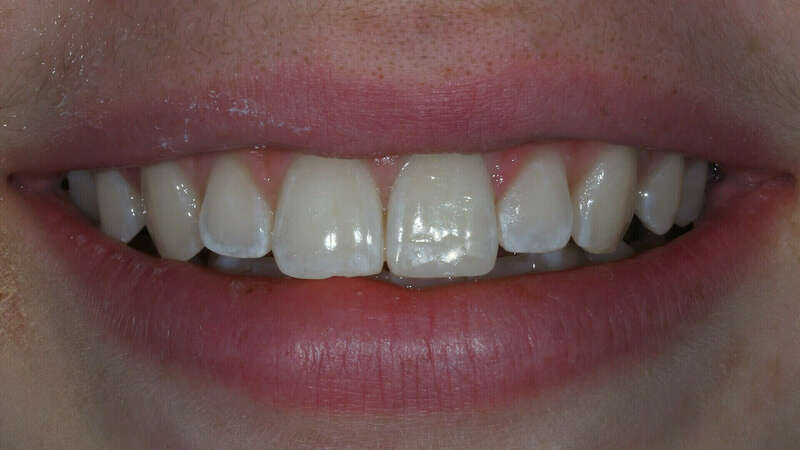 Patiente venue consulter pour améliorer son sourire. Un éclaircissement interne de l'incisive centrale gauche associé à un éclaircissement externe de l'ensemble des dents par gouttière à port nocturne ont été réalisés.