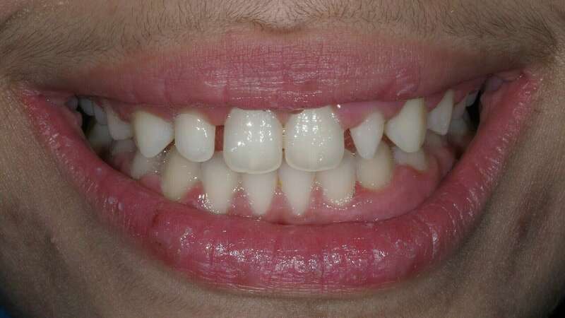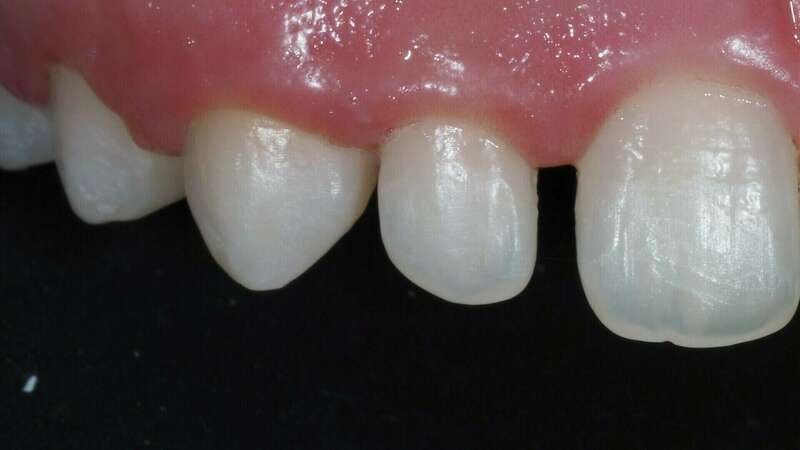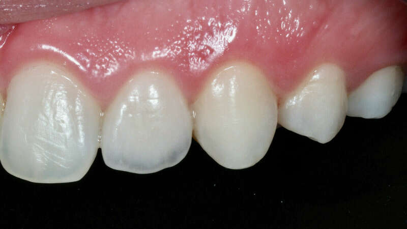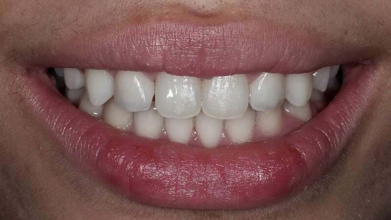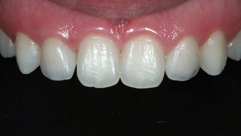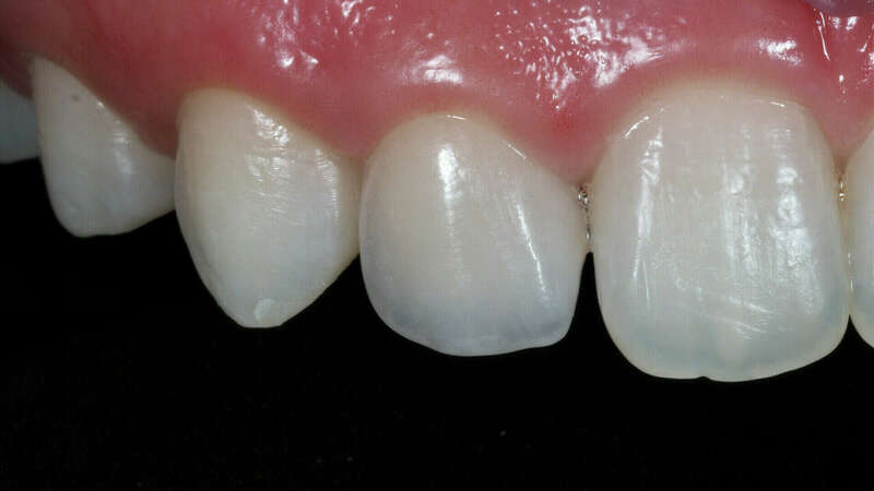 Patiente adressée par son orthodontiste après la fin du traitement pour restaurer les incisives latérales riziforme (en forme de grain de riz). Deux facettes en céramique stratifiées ont été réalisées quasiment sans délabrement de la dent en reproduisant l'ensemble des caractéristiques esthétique des jeunes dents de la patiente.