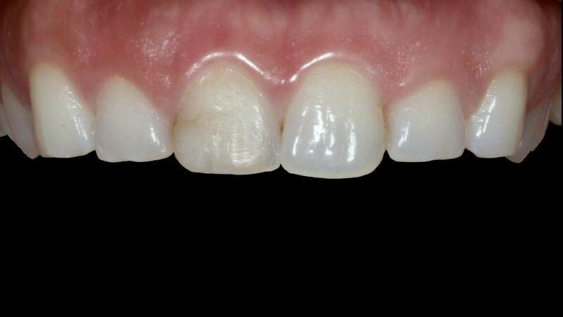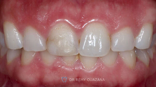 Traitement réalisé : Eclaircissement externe des dents ("blanchiment"), puis réalisation d'une seule facette en céramique Emax stratifiée